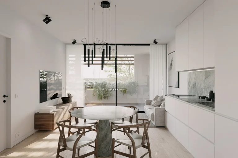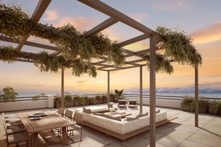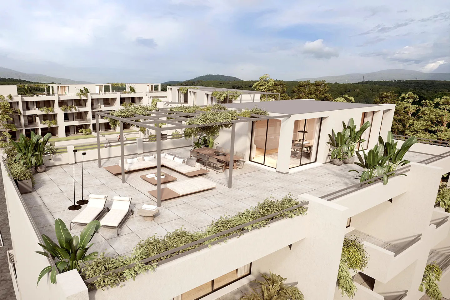Il Residence Marina 35 è composto da due edifici, B1 e B2, sviluppati su quattro piani fuori terra. Il piano attico è caratterizzato da generose terrazze panoramiche che godono di una vista mozzafiato sull’isola d’Elba. Al piano interrato sono disponibili i garage annessi agli appartamenti, oltre ai posti auto esterni. Il progetto architettonico ha previsto l’uso di coperture piane e ampie terrazze loggiate che prolungano lo spazio di vita interno anche all’esterno degli appartamenti con vista sul mare. I due blocchi sono disposti in modo tale che tutte le zone giorno risultano orientate verso il mare. La disposizione a ferro di cavallo degli edifici comprende un’area esterna collettiva con percorsi pavimentati e porzioni a verde come spazio di aggregazione. La zona comune consente una maggior privacy agli abitanti del residence, mantenendosi a una quota maggiore rispetto alla strada che costeggia il canale navigabile. Gli esterni si contraddistinguono per la linearità della forma e la distribuzione delle terrazze movimenta le facciate, attraverso l’alternanza dei vuoti e dei pieni. L’intonaco chiaro degli edifici crea un piacevole contrasto con il verde circostante.